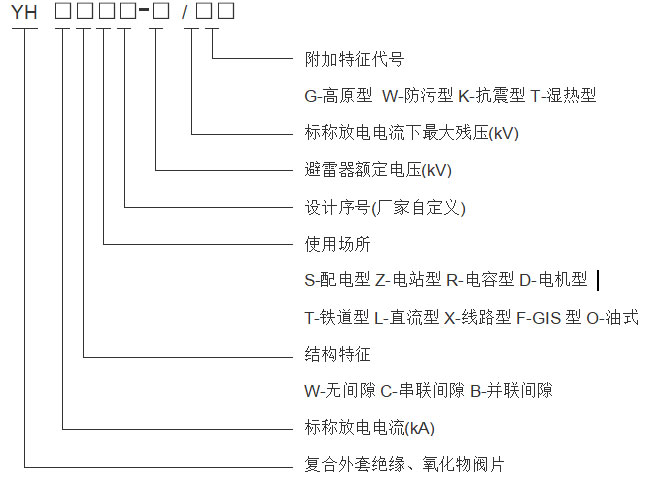 本產(chǎn)品型號含義完全執(zhí)行JB/T8459-1996《避雷器產(chǎn)品型號編制方法》的規(guī)格,具體型號說明如下: